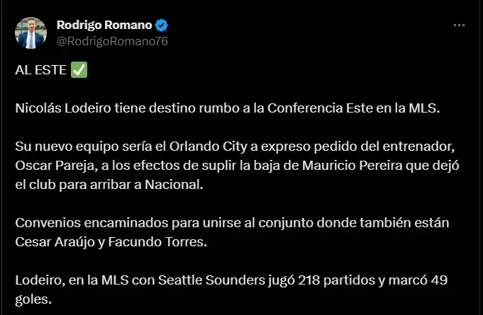 “Nicolás Lodeiro tiene destino rumbo a la Conferencia Este en la MLS. Su nuevo equipo sería el Orlando City a expreso pedido del entrenador Oscar Pareja, a los efectos de suplir la baja de Mauricio Pereira que dejó el club para arribar a Nacional. Convenios encaminados para unirse al conjunto donde también están Cesar Araújo y Facundo Torres. Lodeiro, en la MLS con Seattle Sounders jugó 218 partidos y marcó 49 goles”; fue la más reciente información del reconocido comunicador Rodrigo Romano. Es así que ´La Pulga´ andaría más triste que el chavo del 8 cuando se enteró que toda la vecindad se iría a Acapulco sin él.