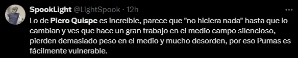 Los hinchas de Pumas no tuvieron ningún reparo en poder destacar el gran partido de Piero Quispe, que si bien no logró dar ninguna asistencia o gol, sigue siendo de los mejores del conjunto mexicano, en el que viene destacando bien y en la victoria contra Pachuca hizo nuevamente un buen partido. Apuesta en Betsson a los partidos de las mejores ligas del mundo y recibe un bono de bienvenida de 50 soles