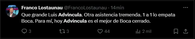 “Advíncula y Blanco son los mejores atacantes de Boca. Excelente combinación del peruano con Saralegui (q bien juega el pibe) y definición de Merentiel dentro del área. Este resultado es más lógico. Empatan 1 a 1 a las 47’ del 1er tiempo. Lindo clásico!”; mencionó Martín Liberman en su cuenta oficial de twitter. “Que grande Luis Advíncula. Otra asistencia tremenda. 1 a 1 lo empata Boca. Para mí, hoy Advíncula es el mejor de Boca cerrado”; enfatizó Franco Lostaunau de ´ESPN´ Argentina.