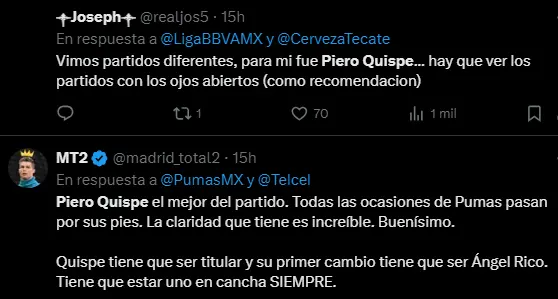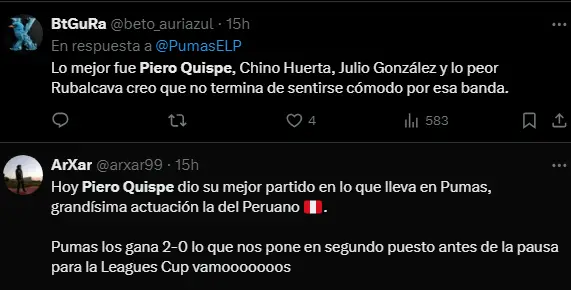 Los hinchas de Pumas quedaron contentos con el ingreso del peruano, uno de los aficionados mencionó: "Piero Quispe el mejor del partido. Todas las ocasiones de Pumas pasan por sus pies. La claridad que tiene es increíble. Buenísimo. Quispe tiene que ser titular y su primer cambio tiene que ser Ángel Rico. Tiene que estar uno en cancha SIEMPRE", fue lo que dijo mediante X, resaltando al mediocampista como el mejor del partido. Otro fan de los 'felinos' agregó: "Hoy Piero Quispe dio su mejor partido en lo que lleva en Pumas, grandísima actuación la del Peruano", también dijo en X.