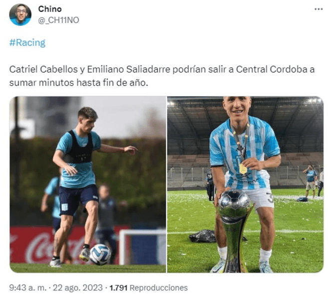 Se ha conocido mediante el periodista Marco Maidana, que Central Córdoba podría llegar a ser el nuevo destino de Catriel Cabellos, quien se iría a préstamo junto a Emiliano Saliadarre, por lo que sería una buena oportunidad para el jugador de tener minutos y así quizás poder irse a otro club que si lo puedan valorar, ya que en la ‘Academia’ la tiene cada vez más difícil, sobre todo por sus nuevos fichajes. "Catriel Cabellos y Emiliano Saliadarre podrían salir a Central Córdoba a sumar minutos hasta fin de año", expresó el comunicador en su cuenta personal de Twitter.