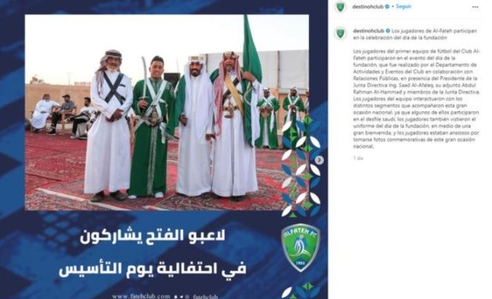 "Los jugadores del equipo interactuaron con los distintos segmentos que acompañaron esta gran ocasión nacional, ya que algunos de ellos participaron en el desfile saudí, los jugadores también vistieorn el uniforme del día de la fundación, en medio de una gran bienvenida", sostuvo en Instagram el Al - Fateh.