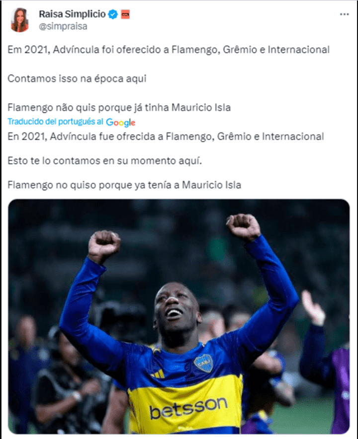 De acuerdo a una información de la periodista brasileña Raisa Simplicio se conoció que Luis Advíncula fue tentando por el Flamengo hace algunos años, pero terminó en nada por un motivo en particular. “En 2021, Advíncula fue ofrecido a Flamengo, Gremio e Internacional. Esto lo dijimos en su momento aquí: Flamengo no lo quiso porque ya tenía a Mauricio Isla"; informó la comunicadora en su cuenta de twitter, pero quién sabe y ahora sí podría darse.