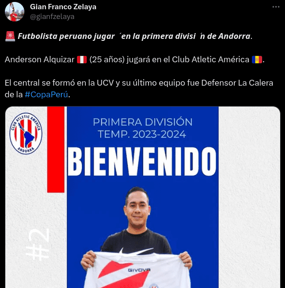 “Anderson Alquizar (25 años) jugará en el Club Atletic América. El central se formó en la UCV y su último equipo fue Defensor La Calera de la #CopaPerú”, dio a conocer el periodista deportivo, Gian Franco Zelaya en sus redes sociales, en donde contó sobre este fichaje que la verdad es que es bastante sorpresivo.