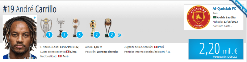 Según lo que es Transfermarkt, André Carrillo hoy en día está cotizado en 2,2 millones de euros, lo que en soles vendría a ser 8,9 millones de soles, una suma bastante elevada para un futbolista peruano en este momento, es por ello que está ocupando el lugar 7 de la lista de jugadores más costosos en el mundo.