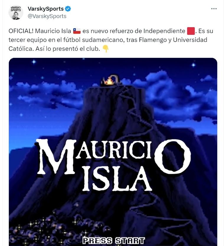 Se trata de Mauricio Isla, así lo dio a conocer el periodista argentino, Juan Pablo Varsky en su cuenta de Twitter. “OFICIAL! Mauricio Isla es nuevo refuerzo de Independiente. Es su tercer equipo en el fútbol sudamericano, tras Flamengo y Universidad Católica. Así lo presentó el club”, reveló el comunicador en dicha red social.