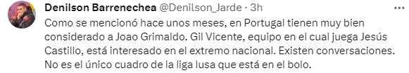 El periodista deportivo, Denilson Barrenechea dio a conocer más sobre esta posible gran venta de Sporting Cristal. “Como se mencionó hace unos meses, en Portugal tienen muy bien considerado a Joao Grimaldo. Gil Vicente, equipo en el cual juega Jesús Castillo, está interesado en el extremo nacional. Existen conversaciones. No es el único cuadro de la liga lusa que está en el bolo,” fue lo que mencionó en sus redes sociales, con lo cual todo indica que su migración está muy cerca.