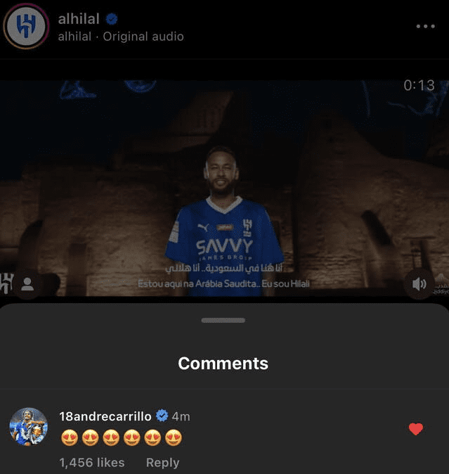 Pese a esto, André Carrillo quien dejó hace nada el club, tomó la decisión de aparecer para dar el visto bueno a este jugadorazo, es por ello que no tardó en dejar sus caritas con ojos de corazón, ya que el peruano se ha convertido en un gran aficionado del Al Hilal, por eso está más que contento con este fichaje, seguramente igual en algún momento se puedan llegar a enfrentar.