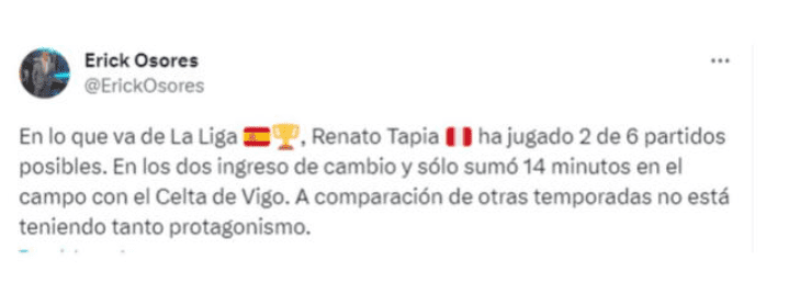 “En lo que va de La Liga, Renato Tapia ha jugado 2 de 6 partidos posibles. En los dos ingresó de cambio y solo sumó 14 minutos en el campo con el Celta de Vigo. A comparación de otras temporadas no está teniendo tanto protagonismo”; fue el contundente comentario con el que el reconocido comunicador deportivo en mención evaluó este arranque de temporada que ha tenido el ´capitán del futuro´ sin dejar de lado que su presencia en el cuadro gallego viene pasando desapercibida para la idea de juego del entrenador Rafa Benítez.