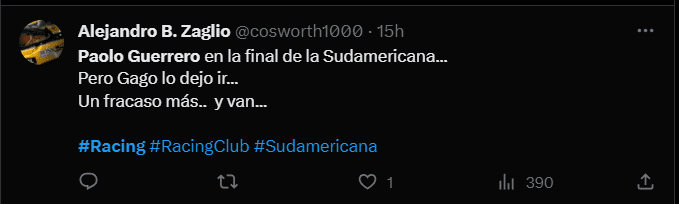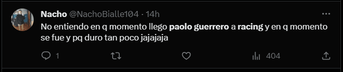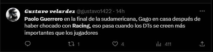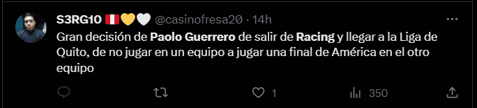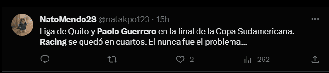 “No entiendo en qué momento llegó Paolo Guerrero a Racing y en qué momento se fue y por qué duró tan poco”, “Paolo Guerrero en la final de la Sudamericana. Gago en casa después de haber chocado con Racing. Eso pasa cuando los DT´s se creen más importantes que los jugadores”, “Gran decisión de Paolo Guerrero de salir de Racing y llegar a la Liga de Quito. De no jugar en equipo a jugar una final de América en el otro equipo”, “Paolo Guerrero en la final de la Sudamericana, pero Gago lo dejó ir. Un fracaso más y van…”, “Liga de Quito y Paolo Guerrero en la final de la Copa Sudamericana. Racing se quedó en cuartos. Él nunca fue el problema”; son algunas de las reacciones de los hinchas del cuadro argentino en las redes sociales.