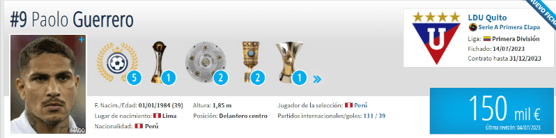El capitán de la Selección peruana y goleador en Liga de Quito tiene una cotización internacional de 150 mil euros, según el portal ´Transfermarkt´. El hecho de disputar una nueva final internacional a los 39 años de edad simplemente demuestra y deja en evidencia que sigue más vigente que nunca, además de continuar dando luces del tremendo goleador de época que será recordado para siempre en el fútbol continental.