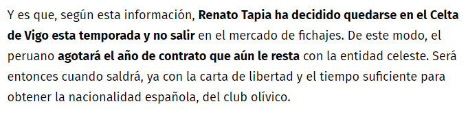 “Y es que, según esta información, Renato Tapia ha decidido quedarse en el Celta de Vigo esta temporada y no salir en el mercado de fichajes. De este modo, el peruano agotará el año de contrato que aún le resta con la entidad celeste. Será entonces cuando saldrá, ya con la carta de libertad y el tiempo suficiente para obtener la nacionalidad española, del club olívico”, se puede llegar a leer en el Medio El Desmarque de España.