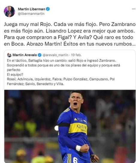 Ahora, antes del encuentro entre Boca Juniors, club donde milita el 'León', y Rosario Central, valido por la tercera jornada de la Liga Profesional Argentina, el comunicador nuevamente arremetió con polémicos comentarios. "Juega muy mal Rojo. Cada vez más flojo. Pero Zambrano es más flojo aún. Lisandro López era mejor que ambos", señaló el 'colorado' en Twitter.