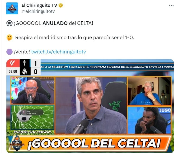 En sólo tres minutos que habían transcurrido en el Celta -Real Madrid y ya el árbitro se convirtió en uno de los protagonistas del partido. El colegiado Isidro Díaz Demera anuló un gol de Larsen por supuesta falta del delantero sobre Kepa, quien reclamó que le habían agarrado de la camiseta. Aunque el gol había sido concedido inicialmente, el VAR decidió llamar al árbitro principal. “¡GOOOOOL ANULADO del CELTA! Respira el madridismo tras lo que parecía ser el 1-0”, precisó el perfil de Twitter de El Chiringuito.