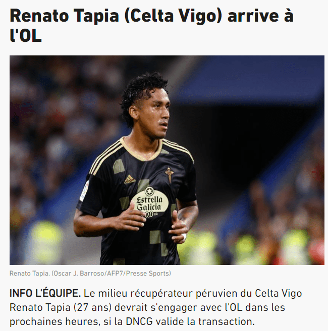 “El mediocampista peruano del Celta de Vigo Renato Tapia (27) debería firmar con OL en las próximas horas, si la DNCG valida la transacción”, fue lo que publicó el portal francés sobre la llegada de Renato Tapia, agregando “El internacional peruano del Celta de Vigo (79 partidos, 5 goles), seguido durante mucho tiempo por Matthieu Louis-Jean, debería llegar en las próximas horas si la DNCG valida el traspaso. La suma no se ha filtrado, pero rondaría los 5 M€ para un jugador al final de contrato en un año en España”, sentenció el medio.