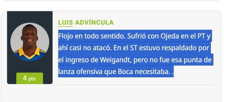 Sin embargo, la prensa argentina calificó de baja la actuación del seleccionado peruano. El Diario Olé le dio una baja puntuación de 4, enfatizando lo siguiente: “Flojo en todo sentido. Sufrió con Ojeda en el PT y ahí casi no atacó. En el ST estuvo respaldado por el ingreso de Weigandt, pero no fue esa punta de lanza ofensiva que Boca necesitaba”.