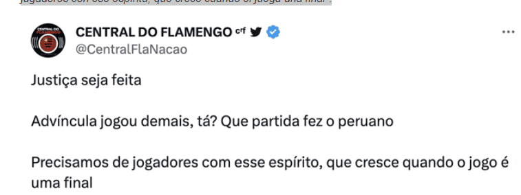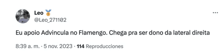 “10 minutos de partido y ya estoy enamorado del fútbol de Advíncula”, “Apoyo a Advíncula en Flamengo. Suficiente para poseer el lado derecho”, “Advíncula jugó demasiado. Necesitamos jugadores con ese espíritu, que crece cuando se juega una final”; son algunos de los comentarios más llamativos que se pueden apreciar en las redes sociales respecto al pedido explícito que le hacen al lateral de la Selección Peruana tras haber sido figura hace unos días en la definición de la Copa Libertadores.