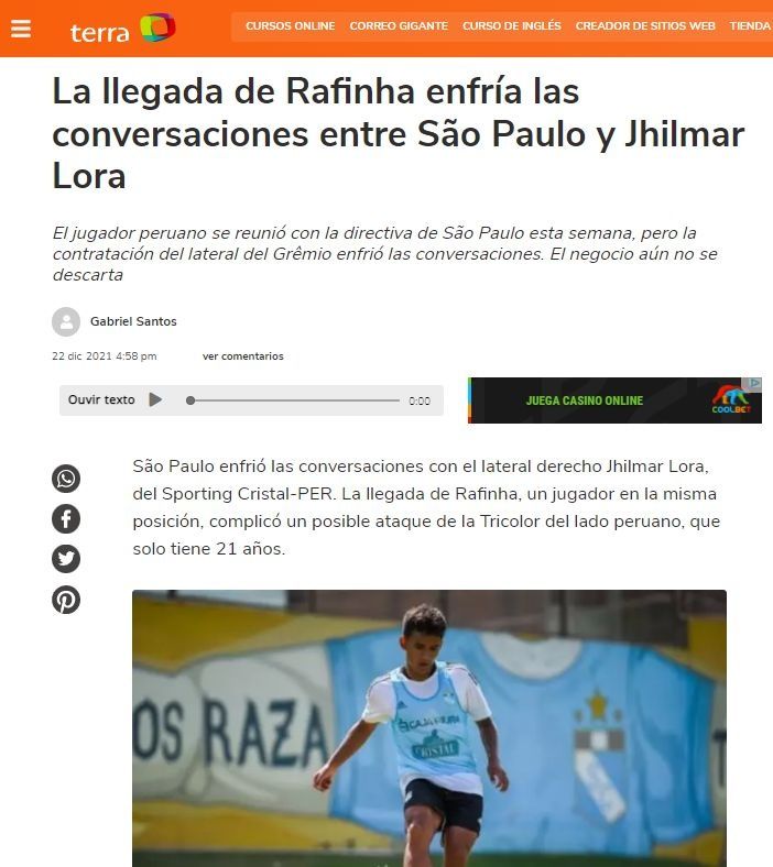"São Paulo enfrió las conversaciones con el lateral derecho Jhilmar Lora, del Sporting Cristal-PER. La llegada de Rafinha, un jugador en la misma posición, complicó un posible ataque de la Tricolor del lado peruano, que solo tiene 21 años", publicó el medio.