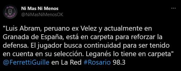 "Luis Abram, peruano ex Vélez y actualmente en Granada de España, está en carpeta para reforzar la defensa. El jugador busca continuidad para ser tenido en cuenta en su selección. Leganés lo tiene en carpeta", publicó el periodista por medio del portal 'Ni Más Ni Menos'.