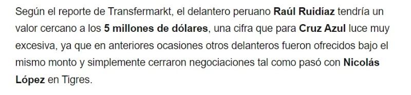El delantero de la ‘Máquina Cementera’, Iván Morales, está ganando anualmente según Salary Sport $367 mil. De esta forma, se estima que lo que podría cobrar Raúl Ruidíaz sería de entre $367 mil a $500 mil por temporada. Veremos qué futuro le depara a la ‘Pulga’, que de llegar a este equipo, se sumaría a la lista de peruanos que pasaron por Cruz Azul, tales como Juan Reynoso, Yoshimar Yotún o Luis Abram.