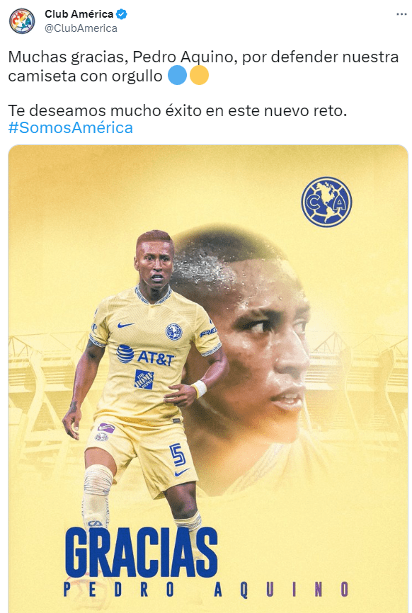 Como es normal en los clubes, se da una despedida a los jugadores que ya no forman parte de la institución deportiva, en este caso se demoraron un poco, pero dejaron este mensaje de despedida para Pedro Aquino. “Muchas gracias, Pedro Aquino, por defender nuestra camiseta con orgullo. Te deseamos mucho éxito en este nuevo reto”, escribió el América en sus redes sociales.