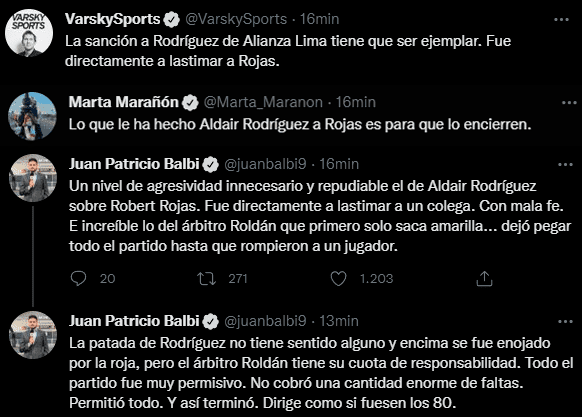 “Un nivel de agresividad innecesario y repudiable el de Aldair Rodríguez sobre Robert Rojas. Fue directamente a lastimar a un colega. Con mala fe. E increíble lo del árbitro Roldán que primero solo saca amarilla... dejó pegar todo el partido hasta que rompieron a un jugador”, manifestó Juan Patricio Balbi tras ver la falta del atacante aliancista.