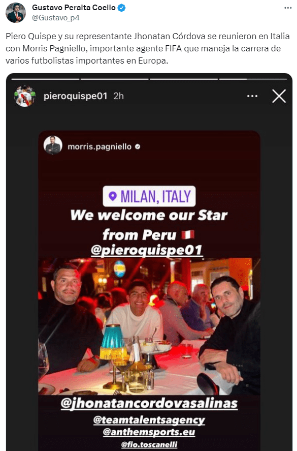 Mediante el periodista deportivo, Gustavo Peralta se ha conocido lo siguiente “Piero Quispe y su representante Jhonatan Córdova se reunieron en Italia con Morris Pagniello, importante agente FIFA que maneja la carrera de varios futbolistas importantes en Europa”, por lo que este agente, es posible que pueda llegar a darle una gran mano a Piero Quispe para que pueda llegar a Europa, así que sería cuestión de tiempo para que se de la salida del mediocampista hacia el exterior.