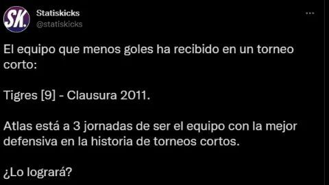 Según compartió StatisKicks, por medio de Twitter, Atlas está a 3 jornadas de ser el equipo con la mejor defensiva de la historia en este tipo de torneos. Dato que sorprendió a los aficionados de los Zorros.