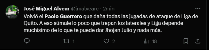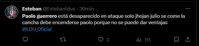 “JAN HURTADO en vez de Paolo Guerrero, para ya”, “Paolo Guerrero está desaparecido en ataque, solo Jhojan julio se come la cancha. Debe encenderse Paolo porque no se puede dar ventajas”, “Volvió el Paolo Guerrero que daña todas las jugadas de ataque de Liga de Quito. A eso súmale lo poco que trepan los laterales y Liga depende muchísimo de lo que te puede dar Jhojan Julio y nada más”; son algunas de las reacciones más resonantes de los hinchas de Liga de Quito en relación al rendimiento del ´Depredador´ en el duelo ante Independiente del Valle.