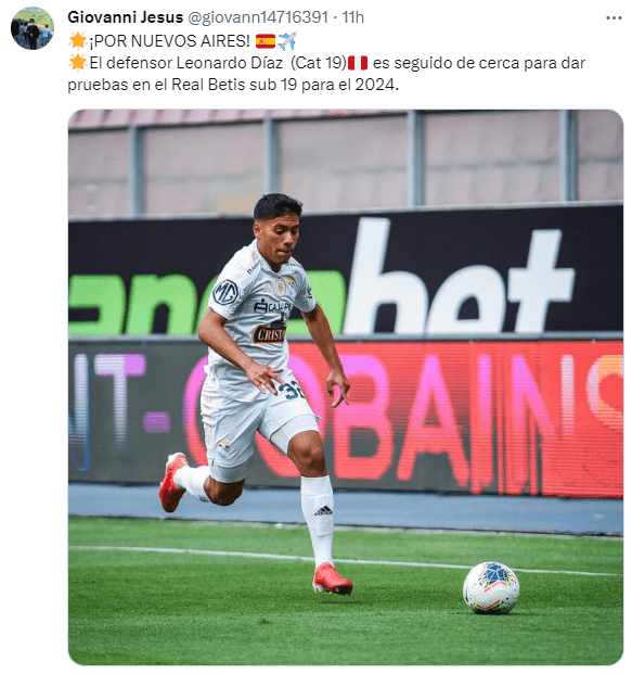 En este caso se trata de Leonardo Díaz, quien ha llamado la atención del cuadro del Real Betis, por lo que según el periodista Giovanni Jesús manifestó en su cuenta de Twitter lo siguiente: “El defensor Leonardo Díaz (Cat 19) es seguido de cerca para dar pruebas en el Real Betis sub 19 para el 2024”, expresó en sus redes sociales, por lo que parece que el central tendrá una oportunidad única para poder emigrar.