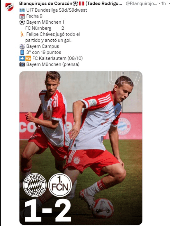 “U17 Bundesliga Sudedwest. Fecha 9. Bayern Múnich 1 – FC Nurnberg 2. Felipe Chávez jugó todo el partido y anotó un gol”; fue la información compartida por la reconocida cuenta de twitter ´Blanquirrojos de Corazón´ en la que no solo señala que el mediocampista con raíces incaicas disputó los 90 minutos de juego, sino que también fue capaz de hacerse presente en el marcador dando un claro mensaje de que estamos frente a un jugador que le gusta aparecer en jugadas ofensivas y así colaborar en dicho aspecto con su equipo.