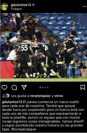 "El jueves comienza un nuevo sueño para cada uno de nosotros. Tendré que apoyar desde fuera por suspensión, pero mi fuerza está con cada uno de mis compañeros que representarán a toda la plantilla", manifestó Gustavo Dulanto en Instagram.