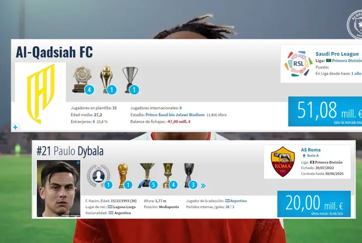 Teniendo en cuenta que Ezequiel Fernández cuesta 14 millones de euros, Julián Quiñones vale 10 millones de euros, Koen Casteels cuesta 6 millones de euros, Pierre-Emerick Aubameyang vale 5 millones de euros, Nahitan Nández cuesta 5 millones de euros, Nacho Fernández 3 millones de euros y que André Carrillo vale 1,5 millones de euros, Al-Qadisyah de Arabia Saudita tiene un precio de 51,08 millones de euros. Dicho esto, con la inminente llegada de Paulo Dybala y sus 20 millones de euros, el costo de la plantilla asciende a los 71,08 millones de euros, según el portal especializado 'Transfermakrt'.