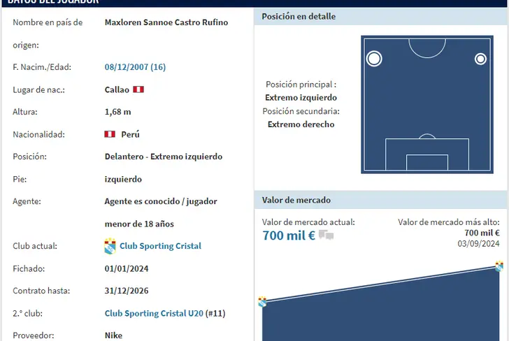 Con tan solo 16 años y un presente muy bueno en Sporting Cristal, Maxloren Castro tiene una cotización internacional de 700 mil euros, lo que en soles daría un promedio cercano a los 2,8 millones, según el portal especializado 'Transfermarkt'. Es vital que pueda seguir creciendo y que sus chances de sumar minutos sean constantes en lo que resta de la presente temporada 2024, así que ya dependerá de las decisiones que pueda tomar en el cuadro rimense y, claro, también en la Selección Peruana.