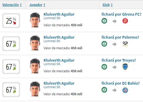Girona, Palermo, Troyes y EC Bahía son los clubes que estarían interesados en contratar a Kluiverth Aguilar, el peruano fue notificado que en el Lommel SK no iba a seguir más, esto por decisión del City Group que lo ve como una opción para salir de la institución en busca que pueda llegar a tener un nuevo rumbo, así que ya se ha conocido a estos 4 equipos a los que podría terminar de llegar según Transfermarkt.