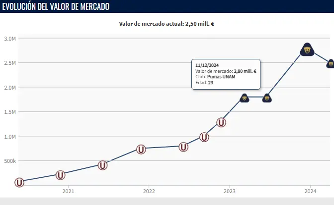 El efecto en su cotización fue inmediato. Según datos actualizados, Piero Quispe cayó de 2.8 millones de euros a 2.5 millones en 2025, una pérdida que supera el millón de soles. Si bien se mantiene como uno de los tres futbolistas peruanos más valiosos —por debajo de Oliver Sonne y Renato Tapia—, la tendencia no es positiva.