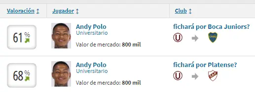Tras lograr el Torneo Apertura nace una oportunidad que pueda emigrar, para comenzar se habla de Platense, pero complicado que Andy Polo decida dejar a Universitario yéndose a un equipo que está muy por debajo, por lo que este cuadro prácticamente quedaría descartado para una posible salida este año. Apuesta en Betsson a los partidos de las mejores ligas del mundo y recibe un bono de bienvenida de 50 soles