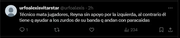 “Que fantasma que es Reyna.. tiene todos los atributos pero se desaparece” y “Técnico mata jugadores, Reyna sin apoyo por la izquierda, al contrario él tiene que ayudar a los zurdos de su banda que andan con paracaídas”; fueron algunas de las reacciones más llamativos y resonantes de los hinchas del cuadro ´Pirata´ en relación al juego que presente el atacante peruano, entendiendo a la vez que de por sí no quedaron muy contentos que digamos con el empate. Apuesta en Betsson a los partidos de las mejores ligas del mundo y recibe un bono de bienvenida de 50 soles