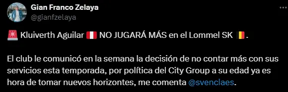 El periodista Gian Franco Zelaya pudo conversar con Sven Claes, quien le terminó contando la situación del peruano, que ya no seguiría en el Lommel SK. "El club le comunicó en la semana la decisión de no contar más con sus servicios esta temporada, por política del City Group a su edad ya es hora de tomar nuevos horizontes", fue lo que se conoció, así que ahora Aguilar tendrá que buscar un nuevo club lo más pronto posible con la temporada ya iniciada en varios países.