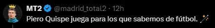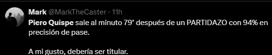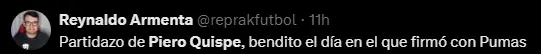Por su parte, el hincha de Pumas UNAM en las redes sociales no dejó de halagar al peruano, quien sin duda alguna es un jugador que sabe marcar una gran diferencia. En este caso, el peruano tuvo una gran efectividad a la hora de dar los pases, mostrando una excelente visión de campo y haciendo que sus compañeros se destaquen. Por este motivo, los hinchas no dudaron ni un solo minuto en resaltar el buen juego de Piero Quispe, quien vuelve a ganarse a los hinchas.