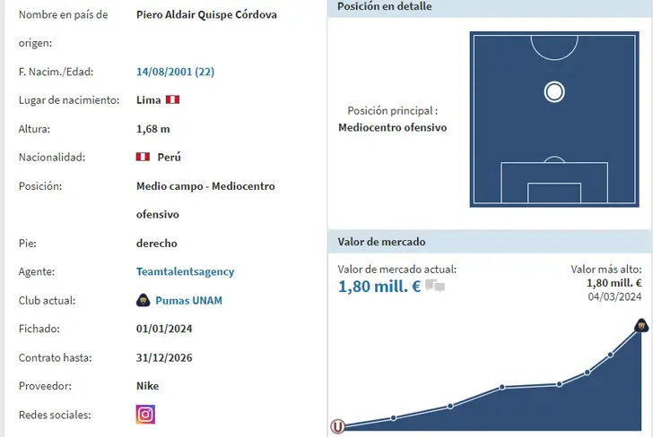 No descubrimos absolutamente nada al asegurar con total firmeza que Piero Quispe es uno de los jugadores peruanos con mayor proyección en el extranjero y vaya que así lo ha venido demostrando vistiendo la camiseta de los Pumas de la UNAM de la Liga MX. Es más, gracias a sus buenos rendimientos en esta primera etapa del campeonato azteca es que ha podido alcanzar los 1,8 millones de euros de cotización internacional en el mercado monetario.