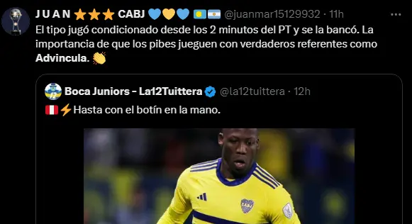 Luis Advíncula hizo un gran partido contra Independiente del Valle, siendo un jugador que en todo momento metió, nunca se amilanó y pese a que le sacaron tarjeta amarilla al inicio de la contienda, esto no hizo que nunca se negocie su entrega, que fue resaltada por los hinchas, los cuales no dejaron de agradecer la gran performance que tuvo en el terreno de juego, así como tratándolo como un gran ídolo de la era moderna de Boca Juniors.