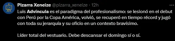 Lo que más se rescata es que tras la Copa América su situación parecía una incógnita, pues si recordamos se lesionó en la primera fecha ante Chile, esto dejaba un futuro algo oscuro para Luis Advíncula, pero pese a no tener muchos días de entrenamiento, decidió ponerse el overol y trabajar con todo por su banda derecha, llegando a ser importante ante Independiente del Valle.