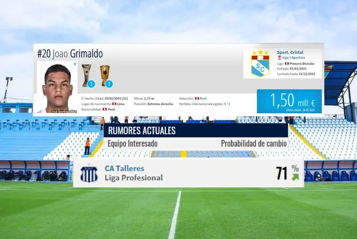 Si tomamos en cuenta lo que hoy en día cuesta Joao Grimaldo a nivel internacional, podemos mencionar que Sporting Cristal podría ganar un monto mínimo de 1,5 millones de euros, lo que en soles daría un promedio de 6 millones. Esta cantidad es la que tranquilamente la directiva celeste podría pedir a cualquier equipo que quiera comprar los servicios del atacante que en estos momentos ya tendría un pie y medio afuera del club de sus amores y en donde nació futbolísticamente.