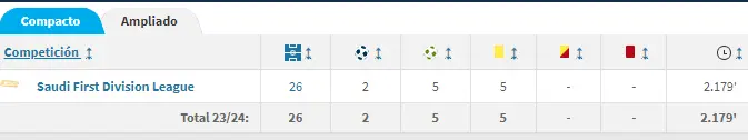 Resulta que en el cuadro de Al-Qadisiyah ha jugado una gran cantidad de encuentros, siendo titular absoluto y solo no jugando por lesión, su posición ideal ha sido en el mediocampo, disputando 26 encuentros a lo largo de la campaña, con 2 goles y 5 asistencias, aparte de 2,179 minutos en juego.