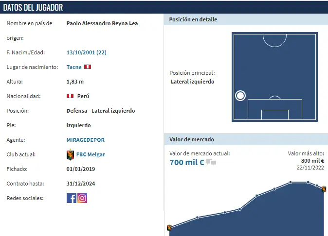 Actualmente Paolo Reyna tiene un valor de mercado de 700 mil euros según Transfermarkt, por lo que es uno de los jugadores por la izquierda más caro, sin llegar a superar eso sí a Marcos López, que al estar en Países Bajos, su cotización es bastante amplia.