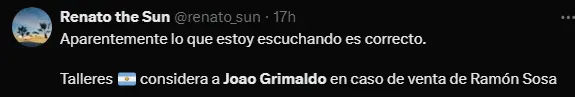 Los jugadores nacionales es muy complicado que lleguen a emigrar, esto es algo que pasa muy seguido, no es tan natural ver a una promesa salir, por lo que esta vez el cuadro de Talleres de Córdoba está viendo la opción de un extremo, pues Ramón Sosa estaría cerca de irse del club, así que quieren un reemplazo y por lo visto el nombre de Joao Grimaldo es uno de los que más suena.