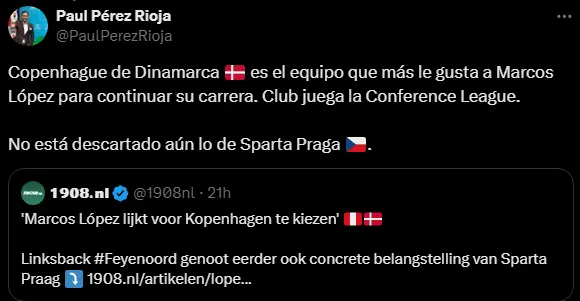El futuro de Marcos López estaría en Dinamarca, en el Copenhague. Al parecer, el cuadro danés estaría muy interesado en poder contar con los servicios del peruano y todo indica que no seguiría en el Feyenoord. Esto ya se conocía desde la semana pasada, incluso no estuvo convocado para el último partido. Por lo tanto, se espera que pronto se pueda resolver su futuro, el cual por el momento se ve bastante incierto ante tantas posibilidades que comienzan a aparecer.