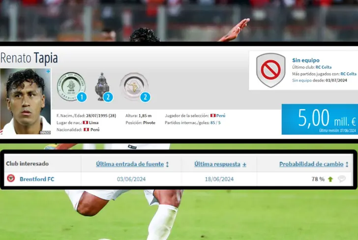 A día de hoy, el futuro inmediato de Renato Tapia en el mundo del fútbol sigue siendo incierto. Tras ser borrado de la Selección Peruana para la Copa América 2024 por un tema de seguros conocido por todos, no renovó su contrato con el Celta de Vigo de la Liga Española, equipo en el que jugó durante 4 temporadas, disputando 25 partidos en la última y acumulando un total de 1449 minutos. Sin club desde hace casi un mes y entrenando por su cuenta para mantenerse en forma, el volante peruano estaría siendo observado por el histórico Brentford de la Premier League de Inglaterra, según el portal internacional 'Transfermarkt'. El club inglés, que terminó en el puesto 16 de la temporada 2023/24 con 39 puntos, logró salvarse del descenso tras una campaña decente con 10 victorias, 9 empates y 19 derrotas.