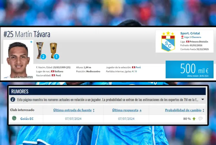 De acuerdo al portal especializado ‘Transfermarkt’, podemos apreciar que Martín Távara tiene un 80% de probabilidades de llegar al Goiás del Brasileirão. Si bien es cierto que hasta el momento no hay algún tipo de acercamiento concreto con la directiva de Sporting Cristal, lo cierto es que el mercado de fichajes en la Liga 1 peruana todavía está abierto hasta el próximo 31 de agosto y podrían venirse algunas sorpresas de por medio, sobre todo cuando al día de hoy el volante nacional no es muy querido que digamos por todos los hinchas rimenses y seguramente podrían celebrar a más no poder el hecho de verlo fuera del plantel de cara a este segundo semestre de la temporada 2024, por lo que desde ya la chance de que pueda llegar al fútbol brasileño sería muy bien tomada desde todo punto de vista.